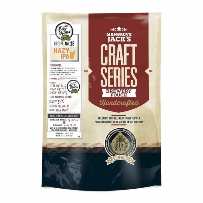Mangrove Jacks Hazy IPA – Join the Hazy sensation and discover a fresh and punchy Hazy IPA with tropical, citrus and stone fruit notes, balanced with moderate bitterness and a smooth finish. Pours hazy gold with a white head – comes with dry hops to create more aroma and flavour in your brew.